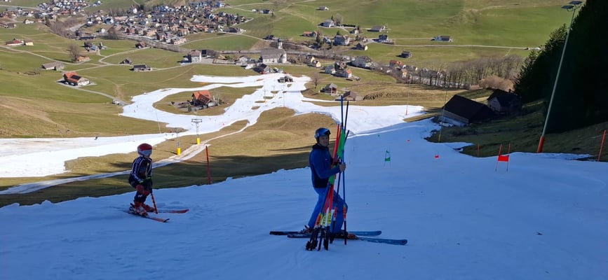 Bei frühlingshaften warmen Bedingungen wurde für die Animation ein GS Rennen in der Chäserugg durchgeführt. Die Kurssetzung war eher für die ganz Jüngsten gesteckt, waren die Torabstände und auch der Torversatz doch sehr eng und gross. So carvten die Jüngsten schnittig durch die Tore, bei den Älteren wurde dies jedoch mit den längeren Skis und entsprechend grösseren Radien zur grossen Herausforderung. Sophia gab ihr Bestes und erreichte nach zwei Läufen den 1. Rang. Bei den Jungs hatte Valerio im ersten Lauf noch einen leichten Vorsprung, welcher jedoch im 2. Lauf dahinschmolz. Am Ende erreichte er einmal mehr bei einem Rennen knapp hinter dem Sieger den tollen 2. Rang. Die Zeit bis zum Rangverlesen verbrachten wir mit genussvollem Skifahren auf den fast menschenleeren Skipisten.